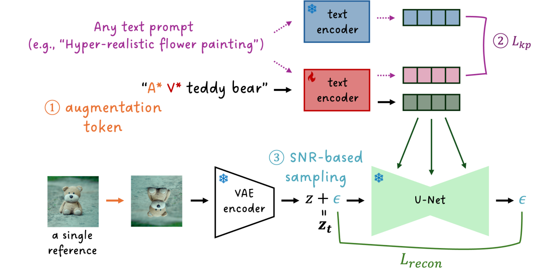 概要: TextBoost[8][9] 通过对文本编码器的选择性微调,实现了文本到图像生成的个性化控制,特别针对一次性个性化场景。该方法采用增强令牌、知识保留损失以及 SNR 加权采样来避免过拟合,并提高生成图像的多样性与质量。TextBoost 可以在仅使用单一参考图像的情况下生成高质量个性化图像,显著减少存储和计算资源需求。