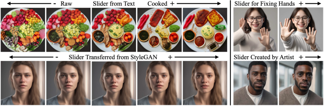 概要: Sliders[4][5] 使用 LoRA Adapter 为 Diffusion 模型提供了更精细的概念控制能力。通过 Sliders,用户可以调整生成过程中图像属性(如光照、纹理)的强度。这种方法允许用户更灵活地操控图像生成,应用于艺术创作和图像编辑领域,显著提升生成图像的质量和多样性。