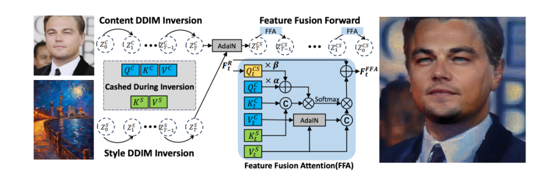 概要: MagicStyle[12] 是一种针对人像的 Diffusion 模型风格化方法,结合内容和风格图像的特征,通过自注意力机制实现图像的纹理与颜色融合。该方法分为两个阶段:CSDI 阶段处理反向去噪以提取图像特征,FFF 阶段通过特征融合将风格信息整合到内容图像中,从而实现高度细致的风格转换,适用于人像的复杂细节处理。